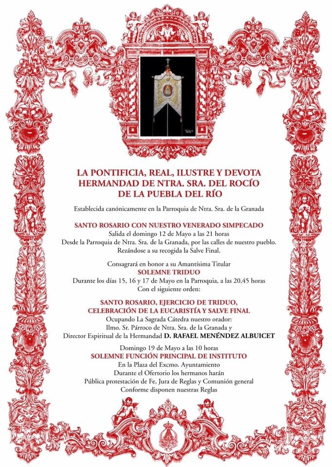 La jornada comenzaba bien temprano en dos escenarios: el Ayuntamiento de La Puebla del Río, engalanado previamente para la ocasión; y la Parroquia de Nuestra Señora de la Granada, desde donde partía la comitiva formada por la Escuela de Tamborileros, Cruz Parroquial, representaciones de hermandades de la zona y La Puebla, ante-presidencia con representación de la Corporación Municipal, presidencia y Bendito Simpecado. Pasadas las 10 de la mañana, el cortejo rociero llegaba a la Plaza del Ayuntamiento, colocaban al Simpecado en la reluciente y recién restaurada carreta de plata y daba comienzo la Función Principal.