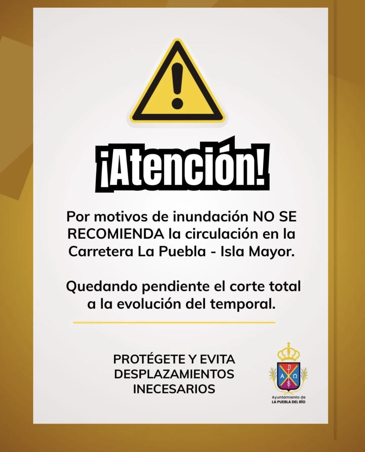 Por zonas inundadas, se recomienda no circular por la carretera La Puebla del Río - Isla Mayor.