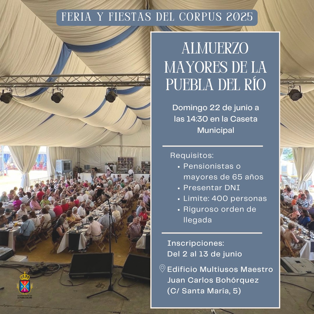 El Ayuntamiento de La Puebla del Río organiza, un año más, su tradicional almuerzo dirigido a las personas mayores del municipio, con motivo de las Fiestas del Corpus 2025.