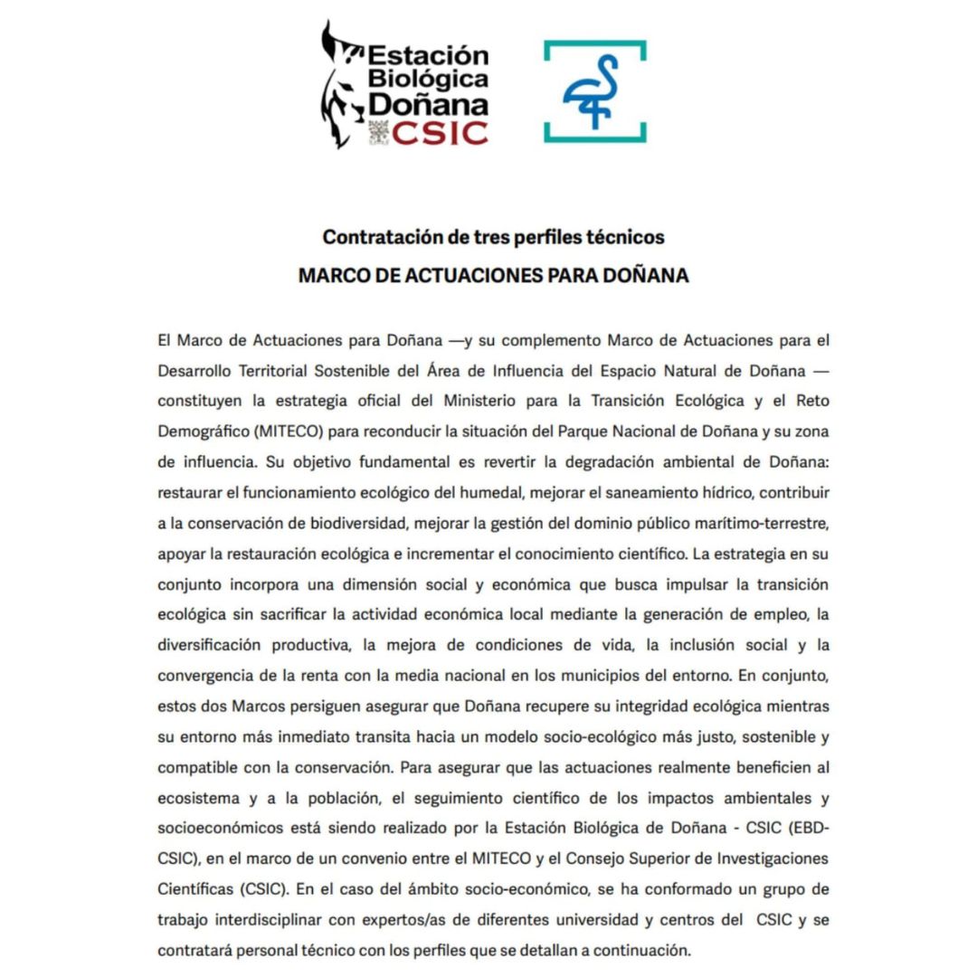 Desde la Estación Biológica de Doñana se informa de la apertura de tres ofertas de empleo vinculadas al Marco de Actuaciones de Doñana, en el contexto del seguimiento de sus impactos socioeconómicos.