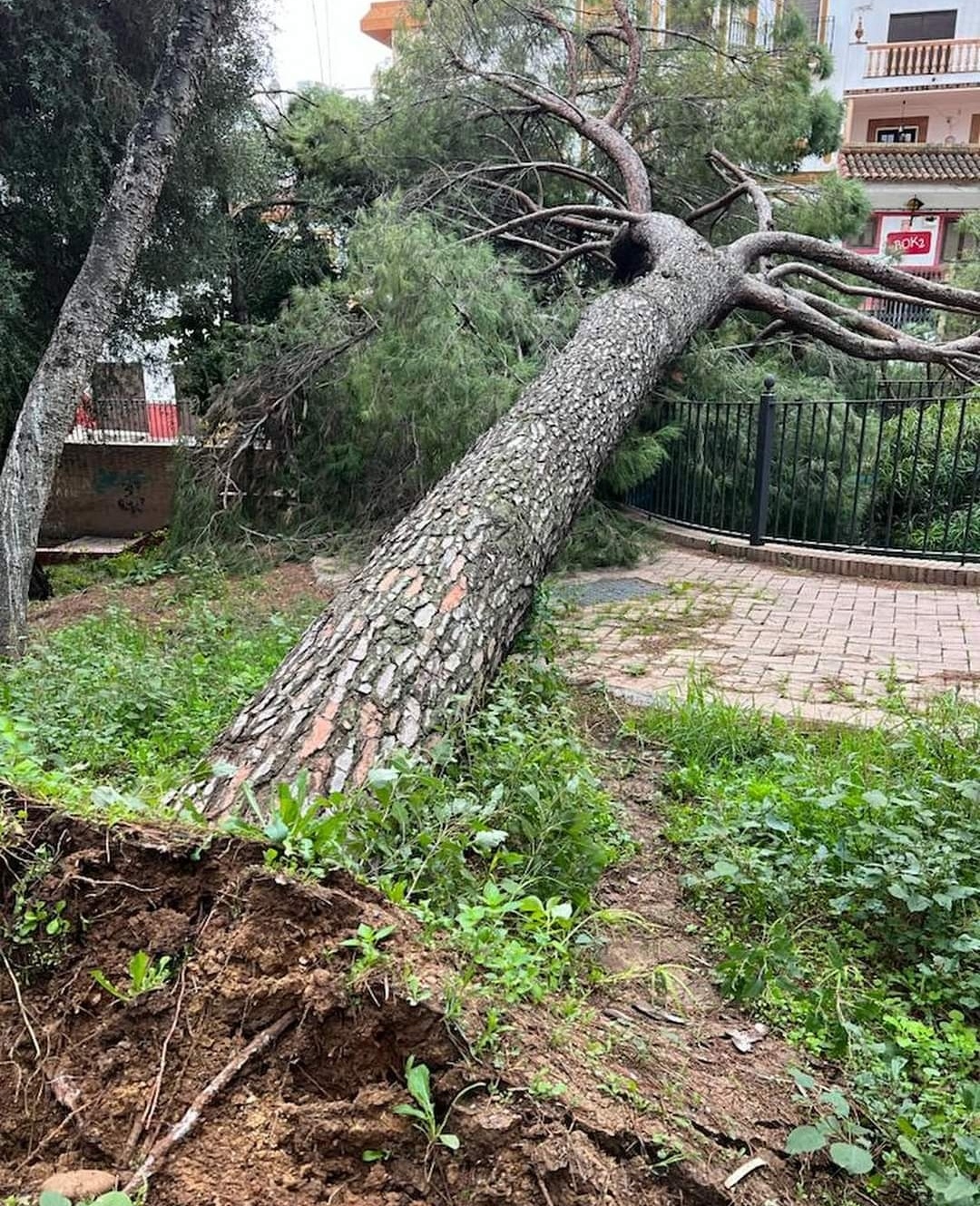Este pino del parque ha caído esta noche. En nuestro bosque han sido muchos. Están demasiado débiles. Pueden ser más.