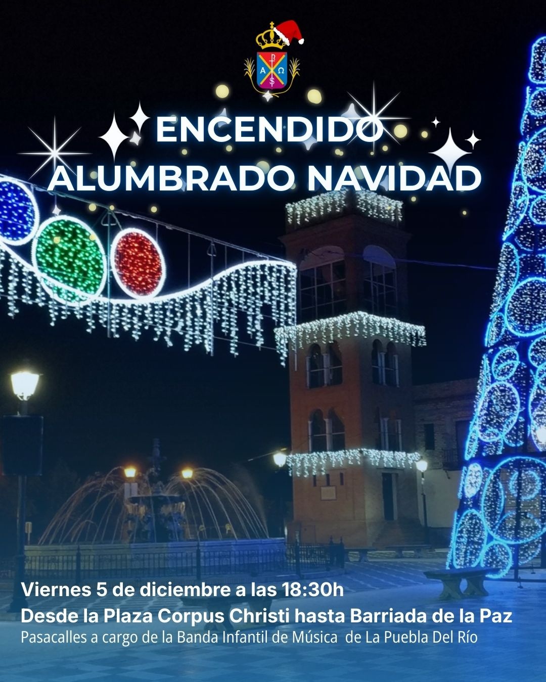 El Ayuntamiento de La Puebla del Río invita a todos los vecinos y vecinas al encendido oficial del alumbrado navideño, que tendrá lugar el viernes 5 de diciembre a las 18:30h en la Plaza del Corpus Christi.