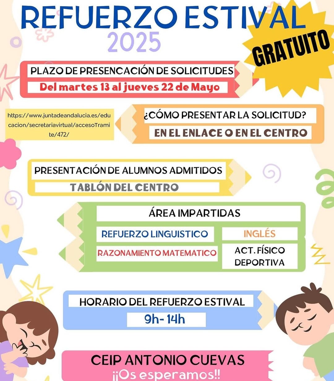 Este verano, el CEIP Antonio Cuevas acogerá el Programa de Refuerzo Estival de la Junta de Andalucía.