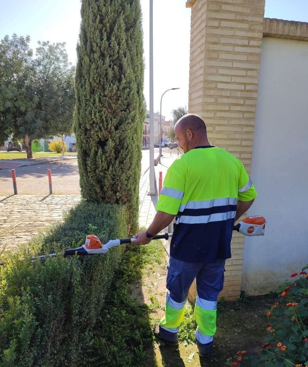 La adjudicataria de mantenimiento de parques y jardines continúa realizando un trabajo destacado en distintas áreas de La Puebla del Río.
