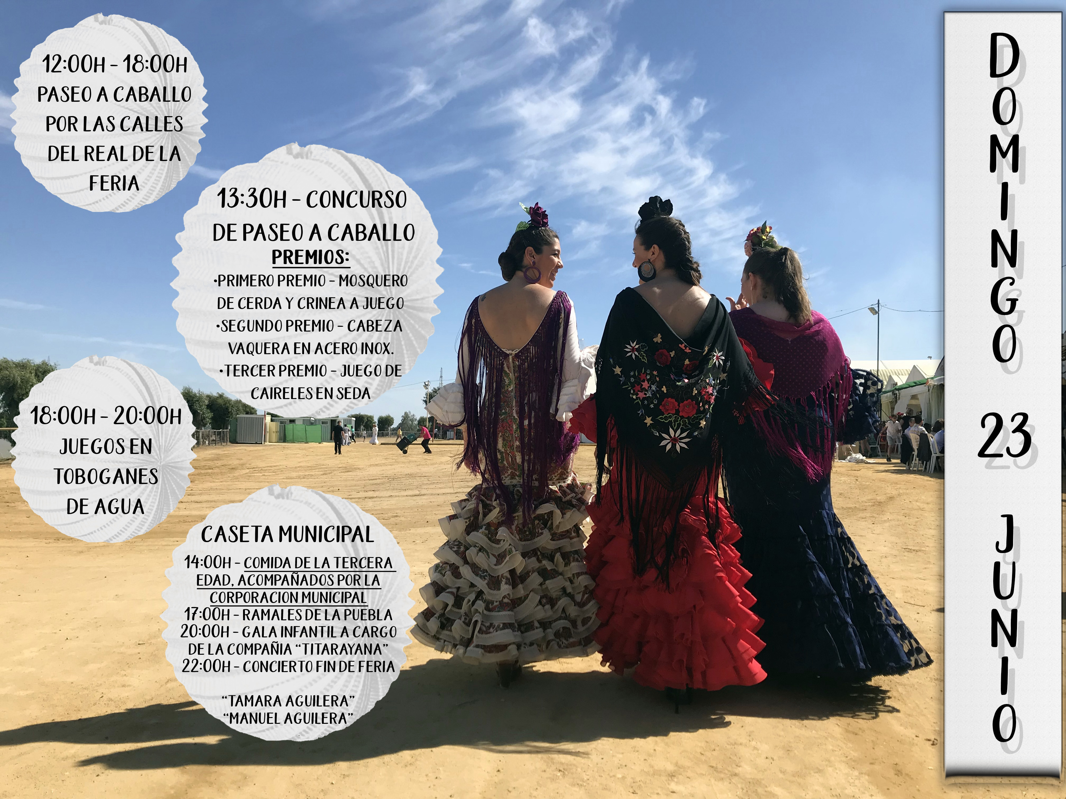La gala infantil Titarayana (20:00 horas) dará paso al concierto fin de feria en la Caseta Municipal, a cargo de Tamara Aguilera y Manuel Aguilera, premios nacionales de flamenco, a las 22:00 horas.