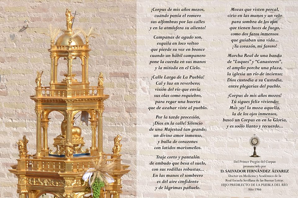Sin embargo, hay una, "El Corpus", que quizás por ser la más antigua en el tiempo, esté más arraigada y la sintamos todos por igual. Efectivamente, en Puebla se vive “por” y “para” las fiestas del Corpus: el año se divide en dos, un antes y un después del Corpus; la limpieza y blanqueado se hacen en el Corpus; la ropa se estrena por el Corpus; el hombre marismeño se desplazaba antiguamente a La Puebla por el Corpus; los que a causa de su trabajo viven fuera, vienen por el Corpus; y nuestra localidad tiene una cierta fama gracias a la "procesión del Corpus". Momento éste, el de la procesión, que nos llena a todos de orgullo, de nostalgia, de recuerdos de seres queridos que ya no están entre nosotros y, ¡como no!, de alegría. El Corpus, pues, es el referente de todos los acontecimientos que suceden en nuestro pueblo. Con la fiesta del Corpus, pues, La Puebla alcanza su momento álgido, y por mucho que haya cambiado a través del tiempo, nuestros sentimientos se mantienen imperecederos cuando llega “el día” y vemos la Custodia en las calles cubiertas de romero. Nos vienen a la mente, por tanto, recuerdos, imágenes, vivencias, nostalgia de otros Corpus, de otros tiempos, de otras formas de vivirlos, como nos ha venido a la memoria al recordar conversaciones oídas de niño a nuestros mayores y de algunos testimonios encontrados en artículos o pregones hallados en esa hemeroteca tan especial que son los antiguos “libros del Corpus”, que, desde 1949, se vienen publicando año tras año.