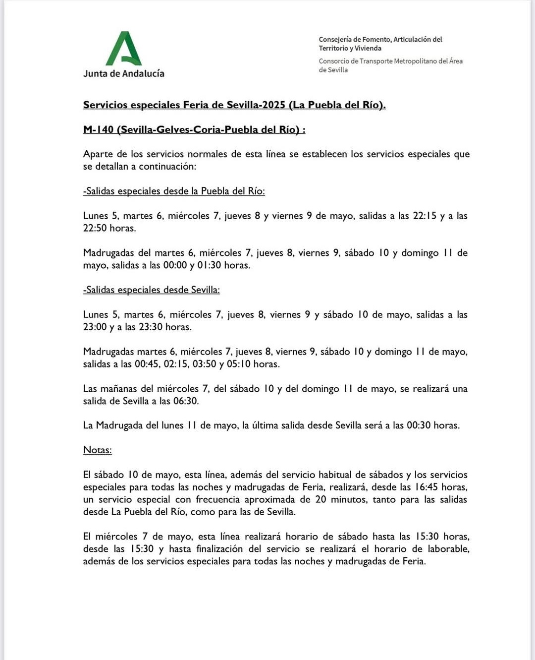 Aparte de los servicios normales de las líneas que cubren el trayecto con La Puebla, se establecen servicios extraordinarios para la línea M-140, con motivo de la Feria de Sevilla, que adjuntamos en imágenes.