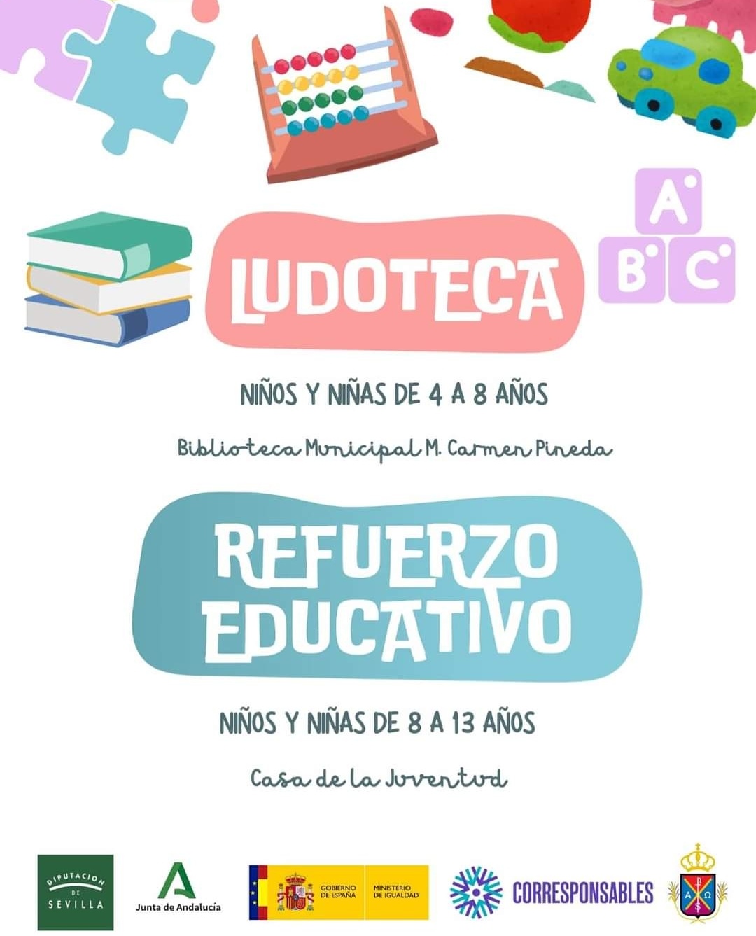 Con la Ludoteca y el Refuerzo Escolar generamos espacios y servicios para el ocio, el desarrollo personal y académico, financiados con fondos de la subvención Corresponsables de la Diputación de Sevilla, para que ningún niño o niña se quede atrás, disfrutando y aprendiendo.