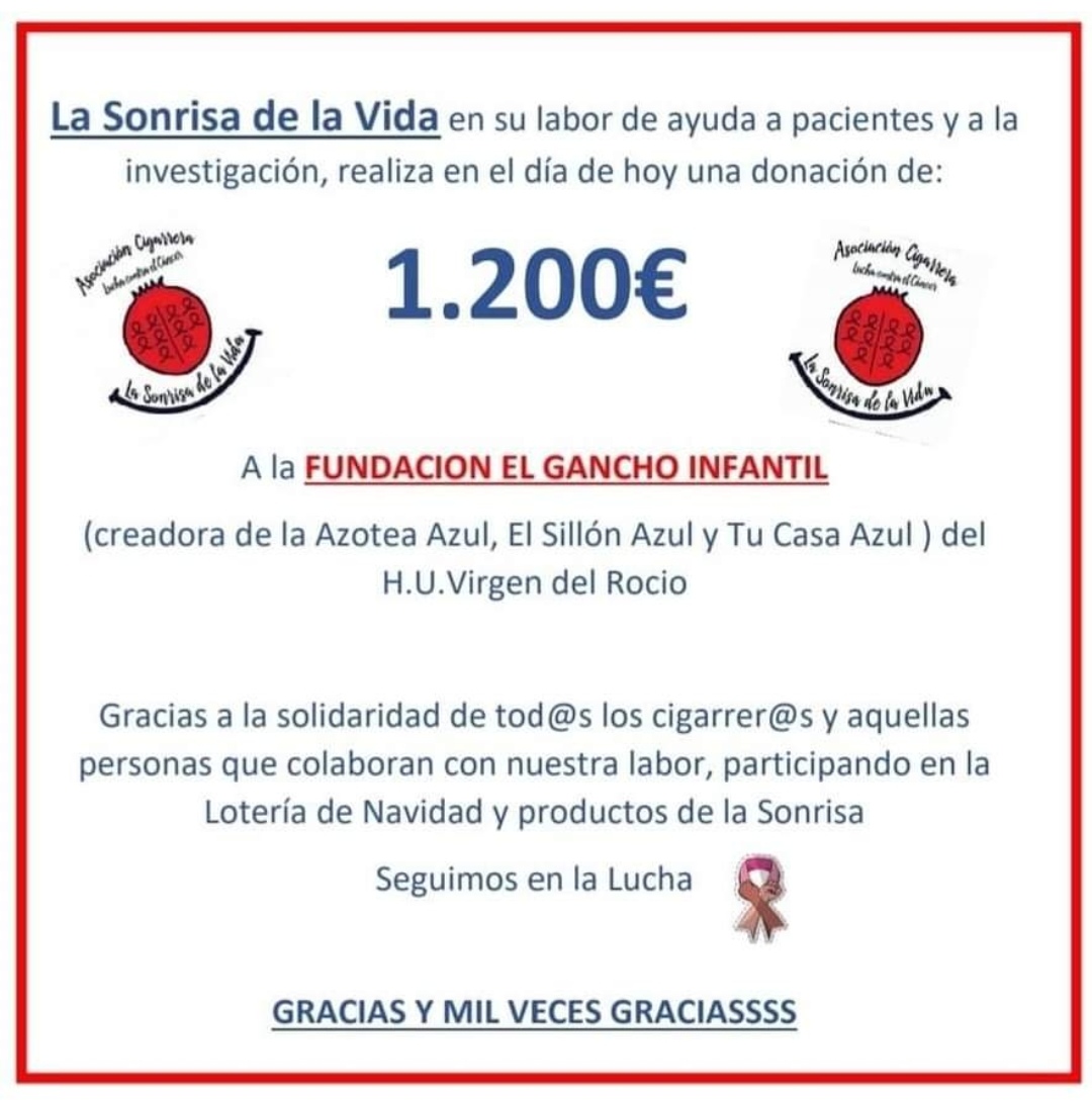Además de prestar ayuda y acompañamiento a pacientes de cáncer, el apoyo a la investigación contra esa lacra es uno de los fines principales de la Asociación, que acaba de realizar una donación de 1.200€ a la Fundación El Gancho Infantil (creadora de la Azotea Azul, El Sillón Azul y Tu Casa Azul) del Virgen del Rocío.