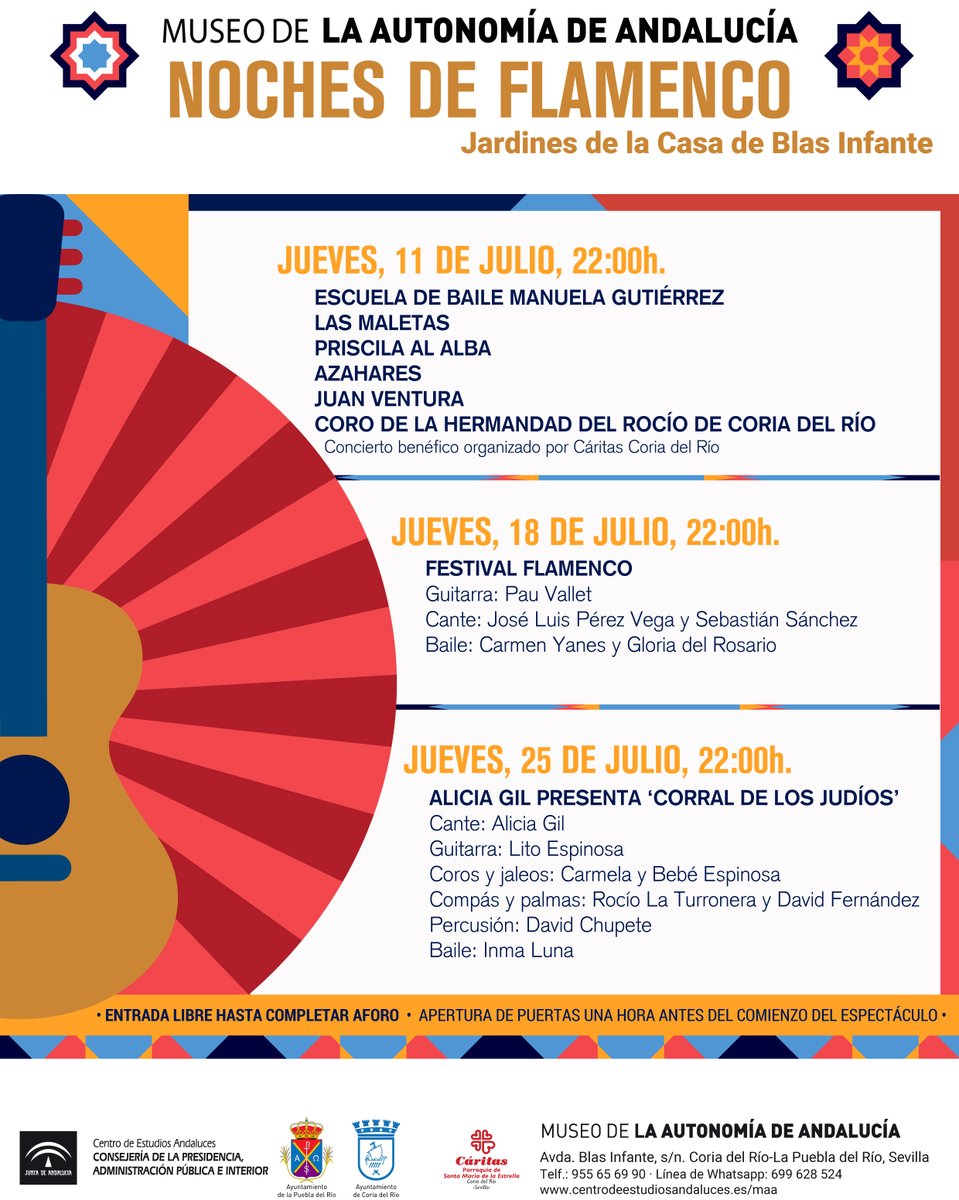Como parte de la programación especial de verano el Museo de la Autonomía de Andalucía ha organizado por vez primera el ciclo ‘Noches de Flamenco’ en colaboración con los Ayuntamientos de Coria del Río y de La Puebla del Río. Tres veladas, los jueves 11, 18 y 25 de julio, a las 22:00 h., con diferentes espectáculos flamencos en los que se combinan la emoción de las voces de los coros rocieros, los nuevos sonidos flamencos, el genio del baile, la maestría a la guitarra y la pasión y dominio en el cante. Como escenario los jardines de la Casa de Blas Infante, conocida también como la Casa de la Alegría. Un entorno idóneo por su privilegiada situación con vistas al río Guadalquivir y también por su significación, ya que Blas Infante fue uno de los primeros intelectuales en estudiar el flamenco y sus orígenes.