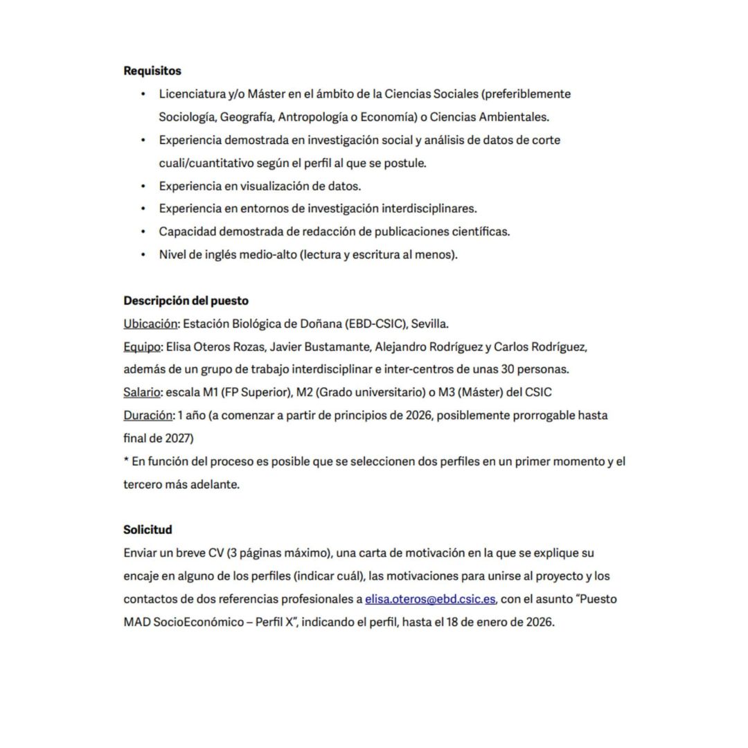 Desde la Estación Biológica de Doñana se informa de la apertura de tres ofertas de empleo vinculadas al Marco de Actuaciones de Doñana, en el contexto del seguimiento de sus impactos socioeconómicos.
