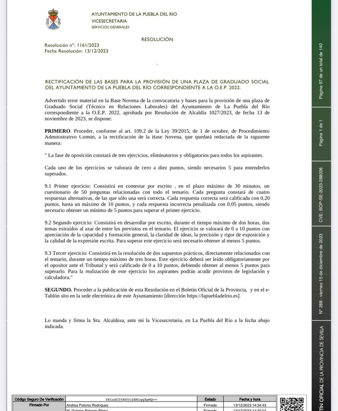 Graduado Social (Técnico en Relaciones Laborales), perteneciente a la escala de Administración Especial, subescala Técnica, mediante el sistema de concurso-oposición en turno libre.