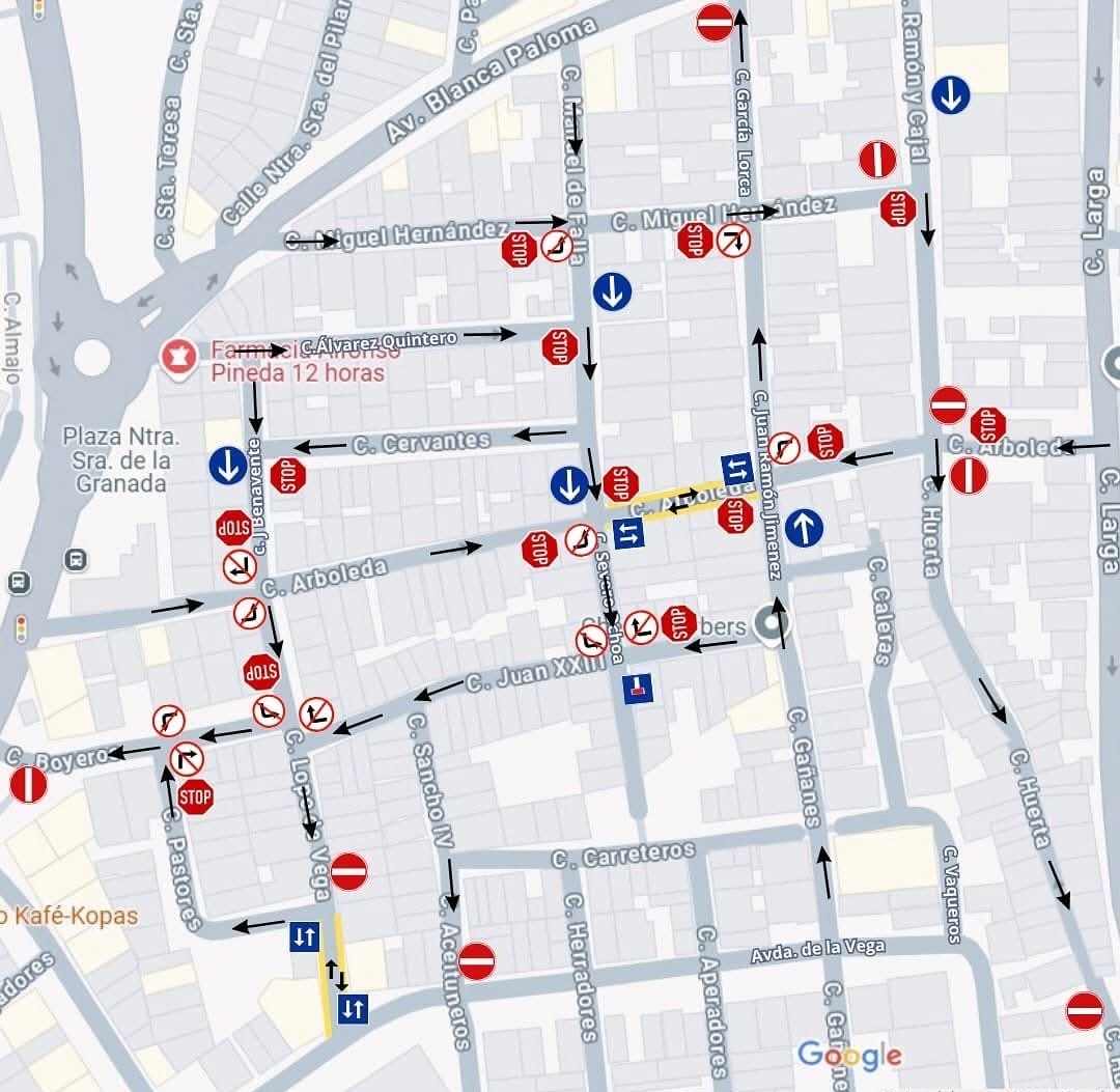 Después de diversas reuniones con la Policía Local y el departamento de Obras y Servicios, y tras estudiar varios diseños con sus pros y sus contras, se ha decidido establecer estos nuevos sentidos de circulación para mejorar la seguridad vial y optimizar el tráfico en la zona.