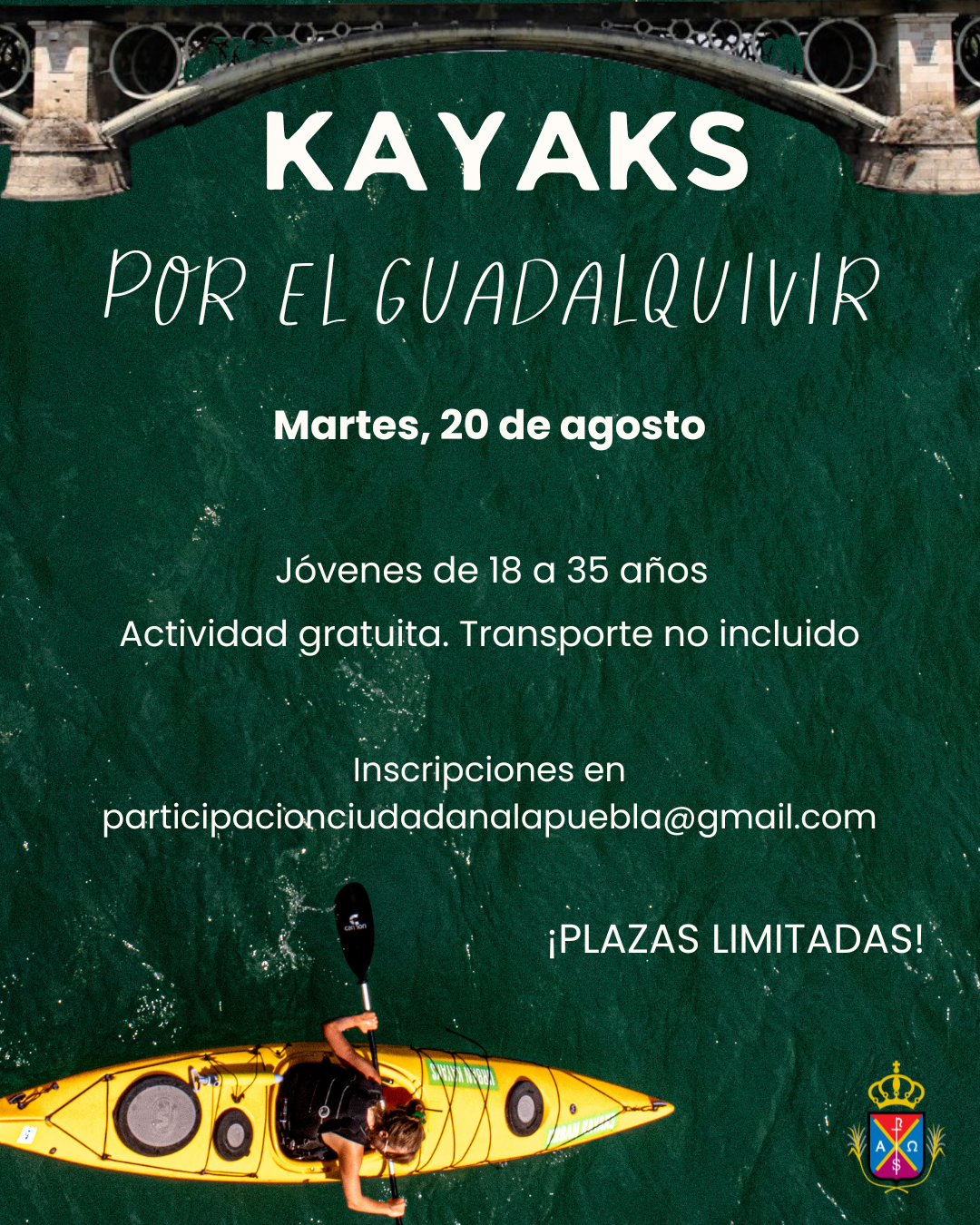 En el Día Mundial de la Juventud, el Ayuntamiento de La Puebla, a través de las Delegaciones de Turismo y Juventud, ofrecen una Ruta gratuita en Kayaks por el Río Guadalquivir, el próximo martes 20 de agosto, dirigida a los jóvenes de entre 18 y 35 años.