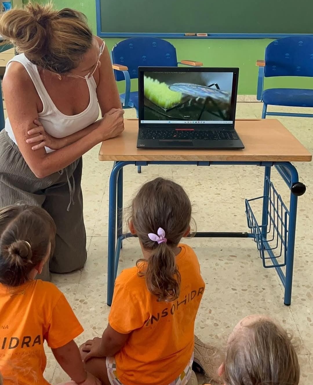 La Delegada de Salud y Educación acompañó a las profesionales durante el taller celebrado en la Escuela de Verano que se desarrolla en el CEIP San Sebastián, destacando la importancia de la concienciación y la educación desde edades tempranas para prevenir los efectos de esta enfermedad transmitida por mosquitos.