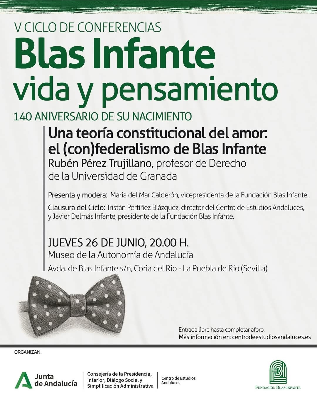 Esta tercera y última conferencia cierra la V edición del Ciclo "Blas Infante, vida y pensamiento", organizado por el Centro de Estudios Andaluces y la Fundación Blas Infante, con motivo del 140 aniversario del nacimiento del Padre de la Patria Andaluza, después de las organizadas en Casares (Málaga) y en Córdoba.