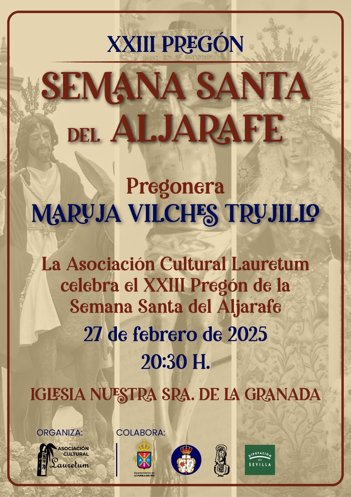Cuando quedan 15 días para que la gran Maruja Vilches pregone la Semana Santa del Aljarafe desde La Puebla del Río, hacemos público el cartel que anuncia este acto tan importante para la precuaresma de nuestra comarca.