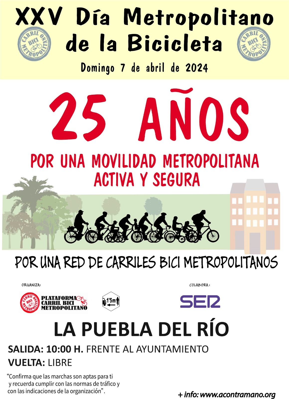 Este año, otra vez más, y ya van 25, se vuelve a celebrar la Marcha Ciclista Metropolitana, para seguir reivindicando una red de carriles bici desde los distintos municipios del Área Metropolitana de Sevilla, una movilidad activa y segura, una intermodalidad Bici+TP, mejores pueblos y mejores ciudades.
